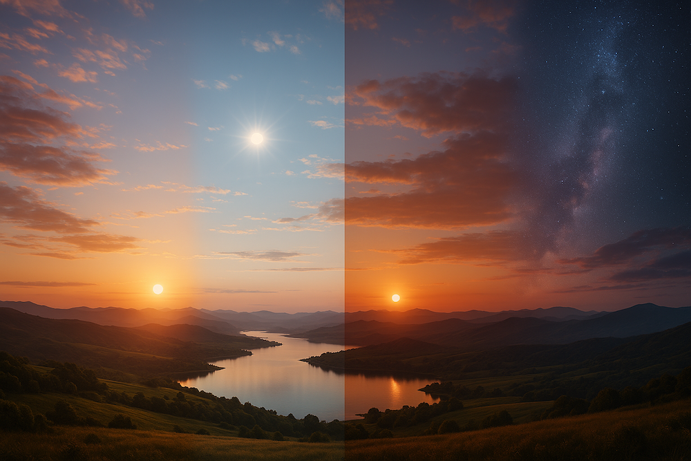 - Scene idea: The sun dips below the horizon as city lights begin to glow.